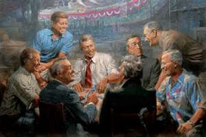 thLaguna Beach is an art town. It seems as if every other shop in the popular part of downtown is an art gallery. In one gallery there is a print that looks as if it were made for Presidents’ Day. The artist has rendered an imaginary gathering of past Presidents around a table. It looks as if Abraham Lincoln has just cracked a joke and Kennedy and F.D.R. are cracking up. Somehow seeing so many of them all together in such a light makes them all seem so ordinary and human — like any gathering of friends around a poker game. It’s hard to imagine that these men influenced the course of human history as much as they did by the decisions they made. And yet they were no different than any one of us, and no better either.